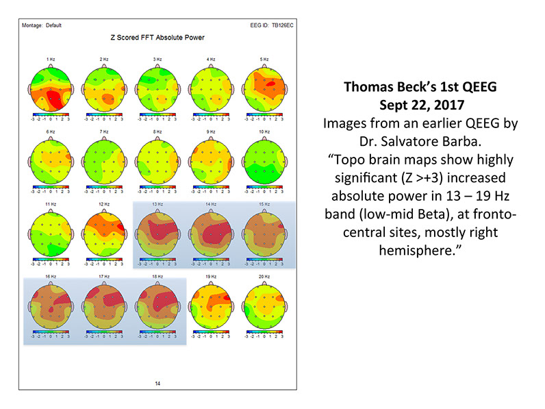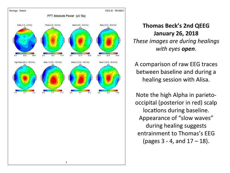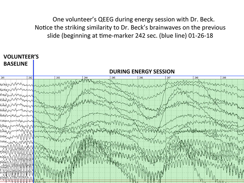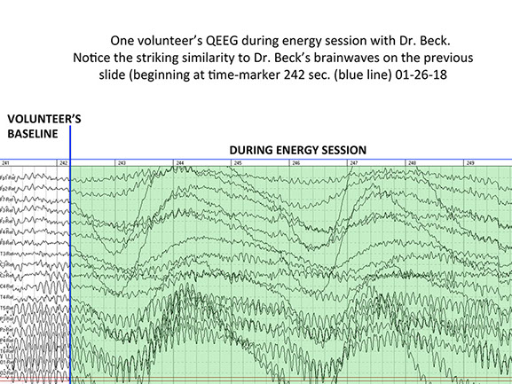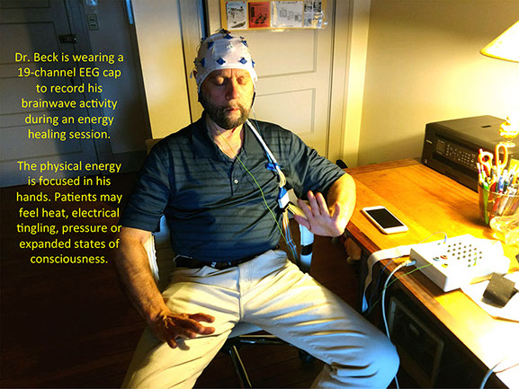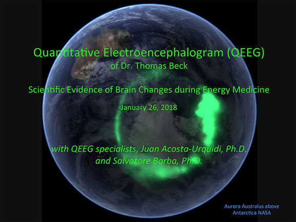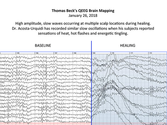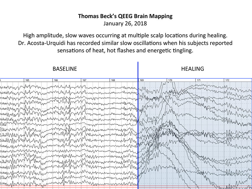 Thomas Beck is undergoing QEEG (Quantitative Electroencephalography) to access his brain wave data during energy medicine sessions. (See above slide show) Two QEEG specialists, Dr. Salvatore Barba and Dr. Juan Acosta-Urquidi, will determine scientifically what makes his brain and CNS unique as a healer. They seek to understand what brain wave frequencies and brain structures allow him to assist people in healing.
