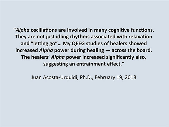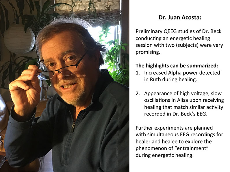 Dr. Juan Acosta-Urquidi, a QEEG expert, has worked with numerous advanced healers and spiritual teachers. He has had the honor to observe and test energy healers using the following modalities: Bioenergetic, Crystals, Pranic, Qi Gong, Reiki, Shamanic, Sound, Therapeutic Touch, and Matrix Energetics. His expertise will shed light on the neurological underpinnings of the ability to help people heal from physical illness, and to advance them spiritually. Energy medicine is the medicine of the future that healers such as Thomas Beck are practicing now.